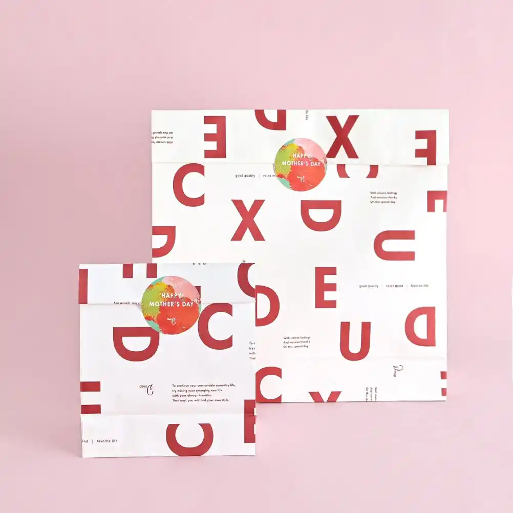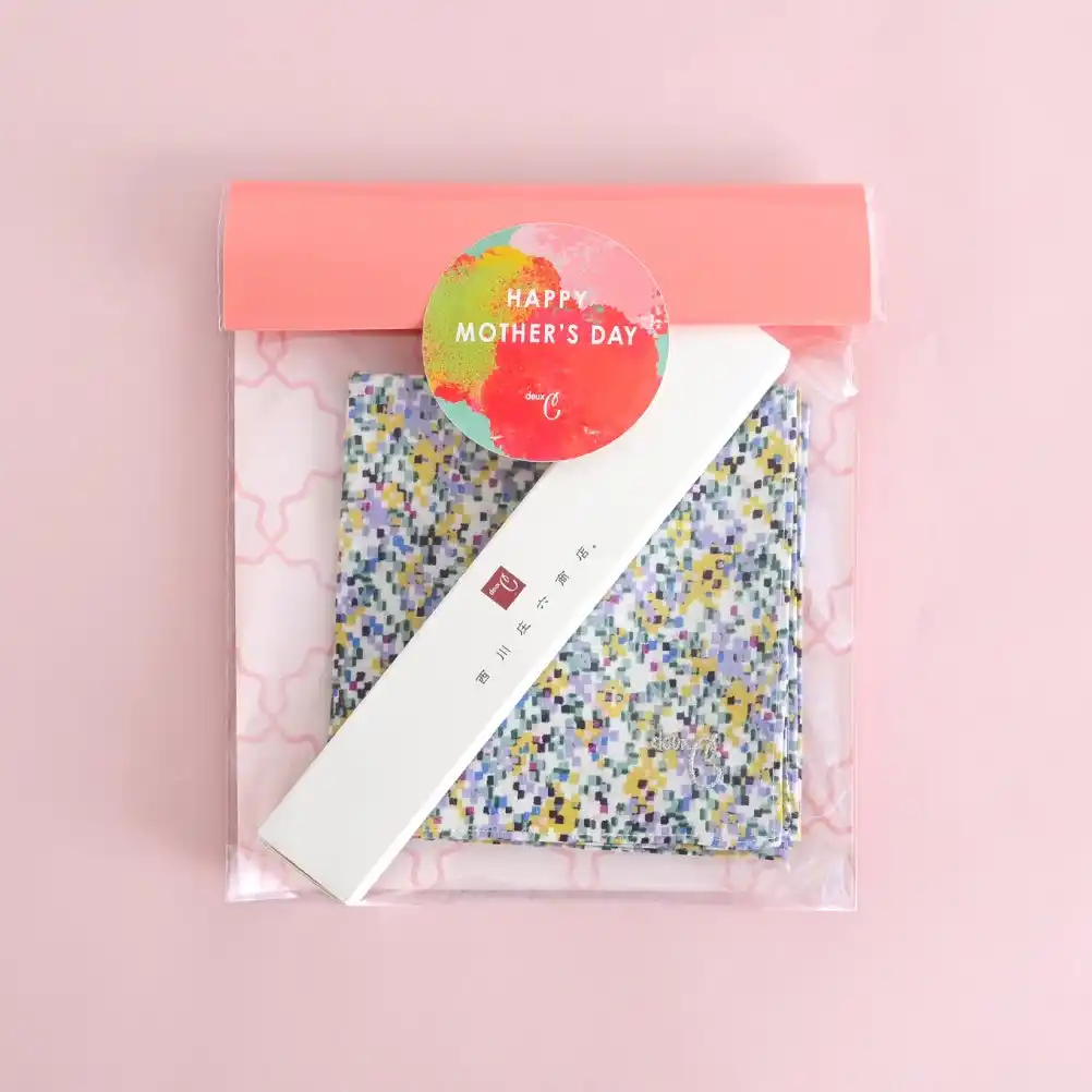 今年のラッピングデザインは、母の日を連想する「花」を、筆のタッチを生かしたようなグラフィックで抽象的に表現し、ナチュラルであたたかみのあるイメージで制作しました。シールやタグなど、各種袋包装やBOXに対応したラッピングをご用意しております。 |