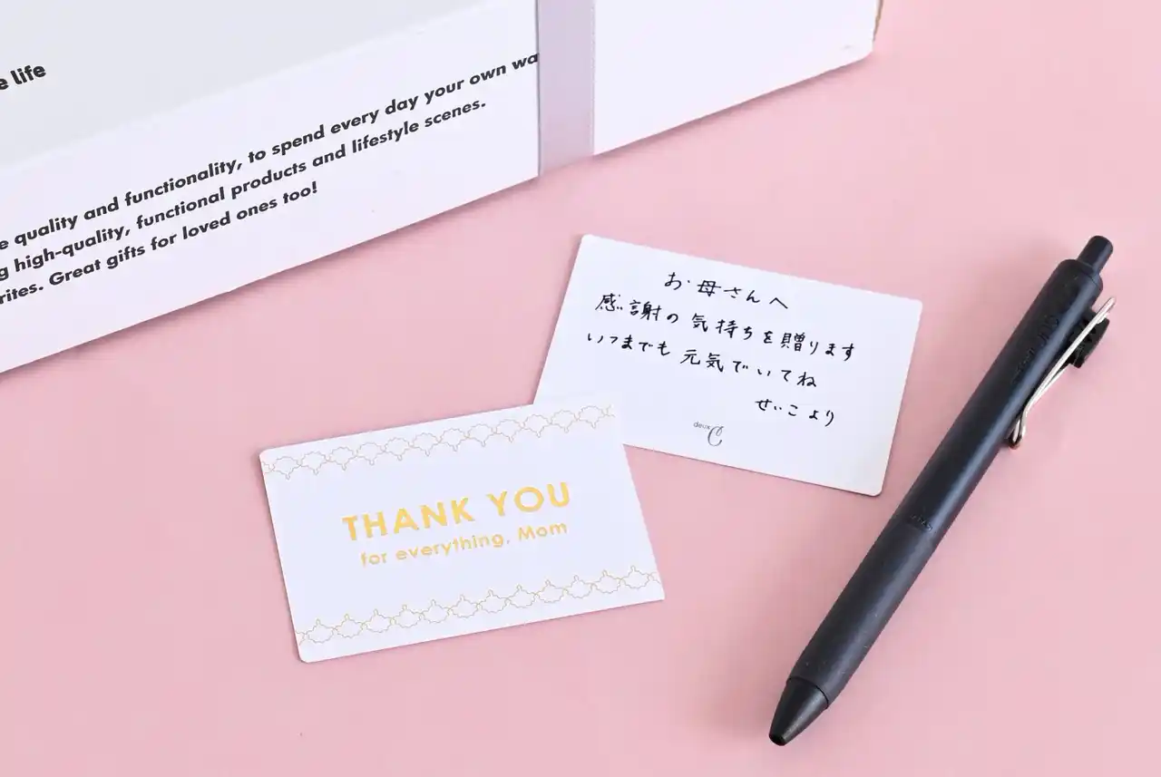 また、お母さんへ感謝の気持ちを伝えるプラスワンのサービスとして、無料のメッセージカードもご用意しております。「THANK YOU for everything, Mom」のメッセージには箔押し加工で華やかさを演出し、そのままギフトに添えても、裏面に手書きのメッセージを書くことも可能です。ぜひ一言添えられてみてはいかがでしょうか。 |
