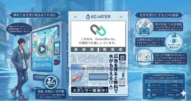 株式会社GenectBox(本社:東京都港区、代表取締役:長坂基史)は、広告動画(15~30秒)を視聴することでミネラルウォーターが無料でもらえる体験型広告メディア「ADWATER(アドウォーター)【特許出願中】」の全国展開に伴い、代理店パートナーの募集を開始いたしました。 ■ 新しい広告の形「ADWATER」とは |