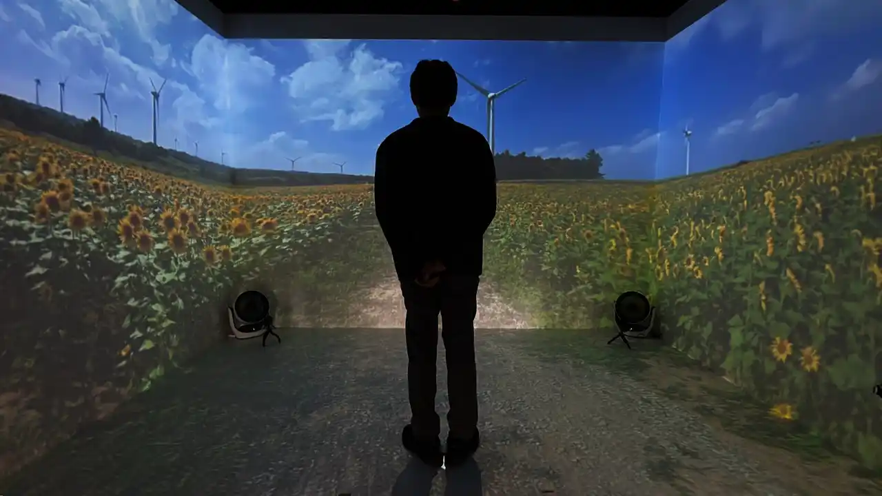 ○没入システムのブース内で福島県の魅力を伝えるべく「郡山布引の風の高原のひまわり畑」、「あづま果樹園」、「霧幻峡の渡し」、「塩屋岬」の気候・風土・環境などを、映像・音響に加え香りも含めて仮想的に体験いただけます。没入システムでの一連の体験が、地域への訪問の動機づけや購買行動に繋がるかを検証します。 |
