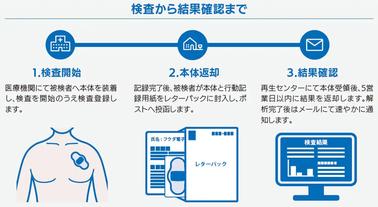 本製品は、薄型・軽量のパッチ型で被検者(患者)の身体に直接貼付することで、日常生活下における心電図を長時間・連続的に記録することが可能な単回使用型ホルター心電計です。
