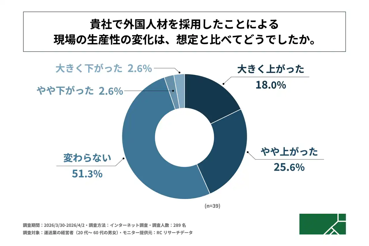 現在、外国人材を採用している運送業の経営者の4割以上が、外国人材の採用によって現場の生産性が想定と比べ「上がった」と回答 |