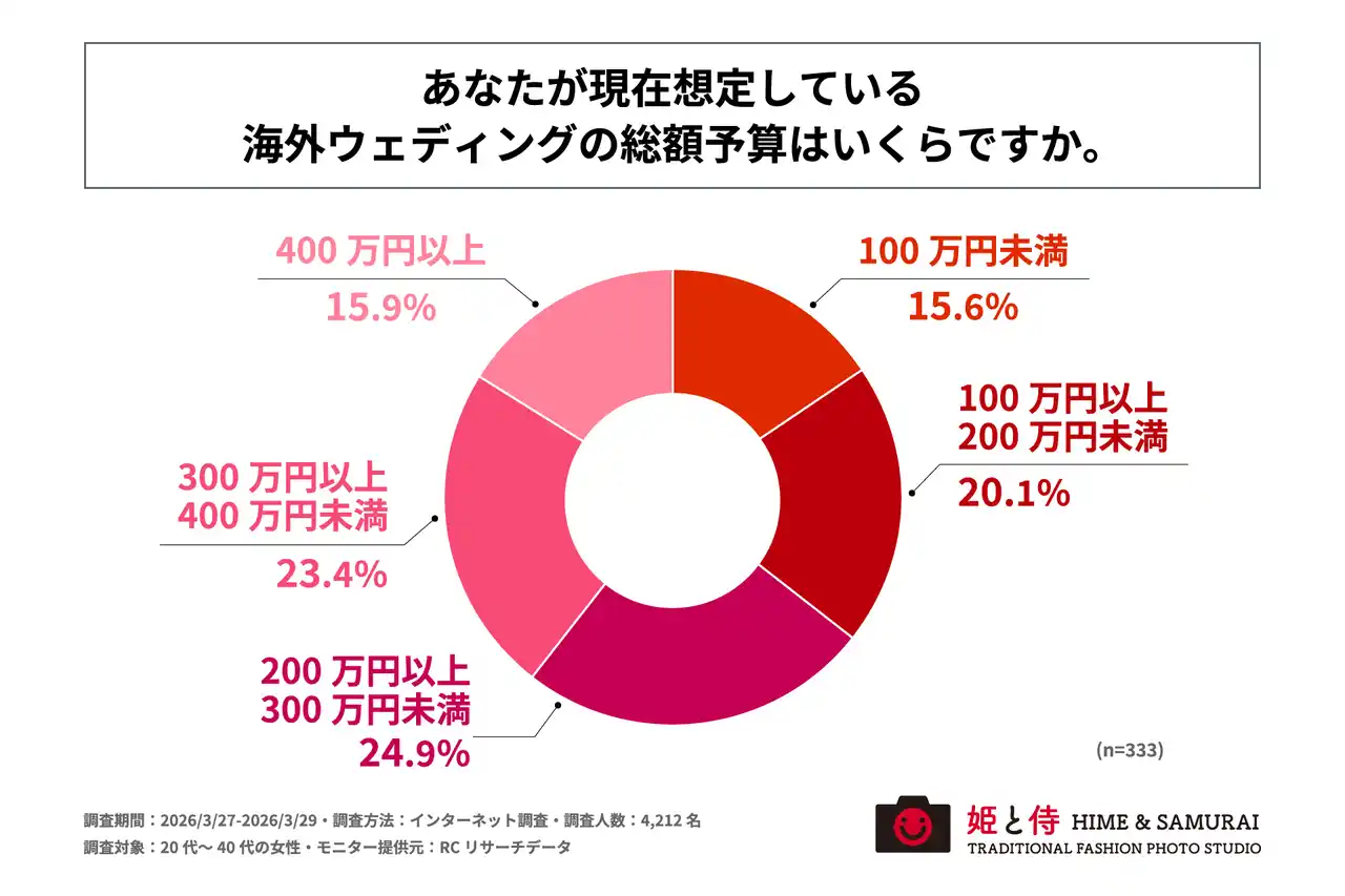 バンコクのフォトスタジオ「姫と侍」を運営する、ジー・ブーン株式会社(本社:東京都江東区、代表取締役:後藤 稔行)は、20代~40代の女性を対象に「円安下における女性の海外ウェディング意識に関する調査」を実施しました。この調査から、20代~40代の女性の海外ウェディングに対する希望の実態や、円安下での予算感、費用を抑えるための工夫などが明らかになりました。