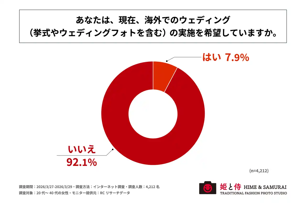まず、「現在、海外でのウェディング(挙式やウェディングフォトを含む)の実施を希望しているか」を尋ねる設問への回答では、「いいえ」が92.1%、「はい」が7.9%という結果になりました。この結果から、20代~40代の女性の約1割が、現在、海外でのウェディングの実施を希望していることがわかりました。 |