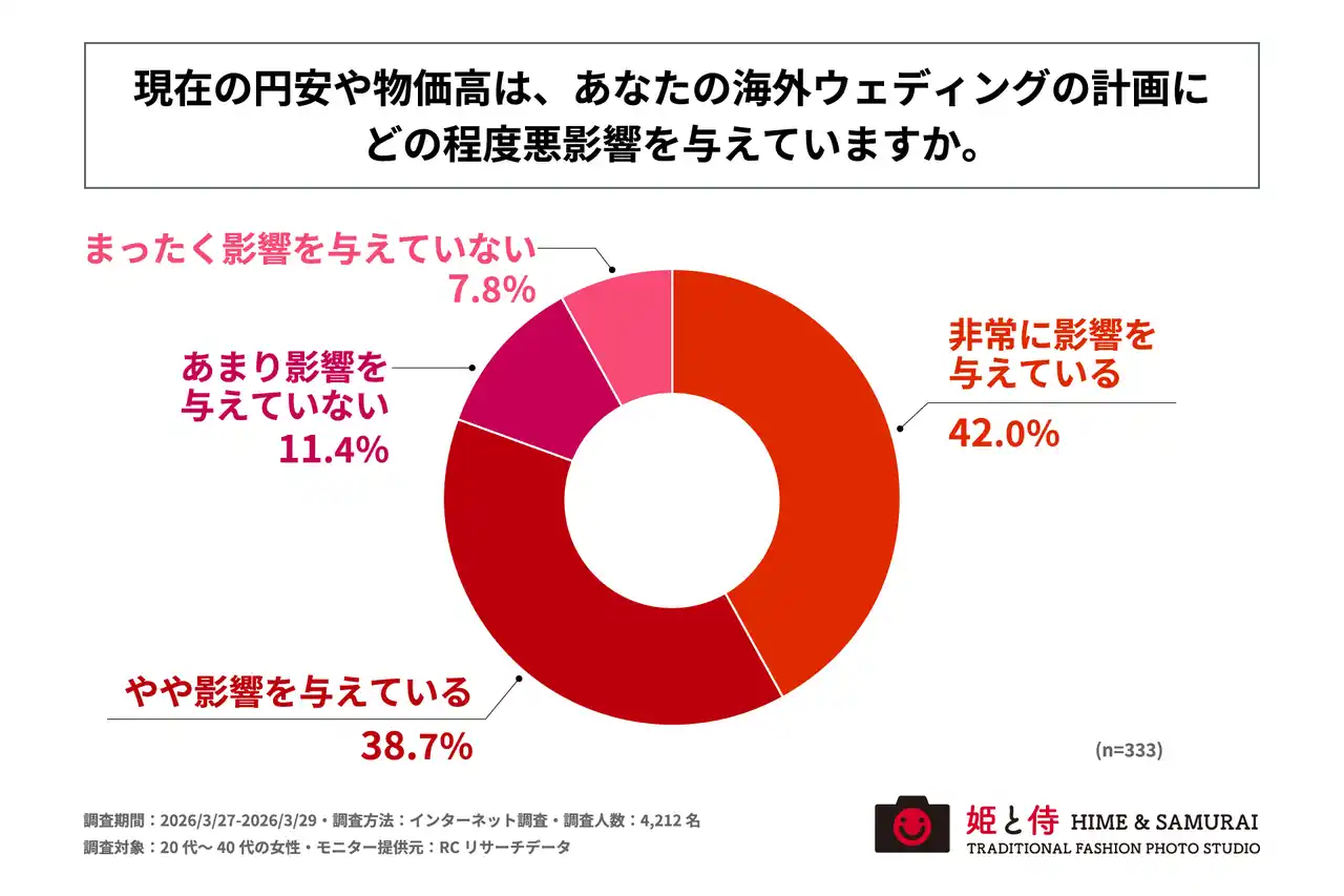 海外ウェディングを希望する女性の8割以上が、現在の円安や物価高は海外ウェディングの計画に「悪影響を与えている」と感じている |