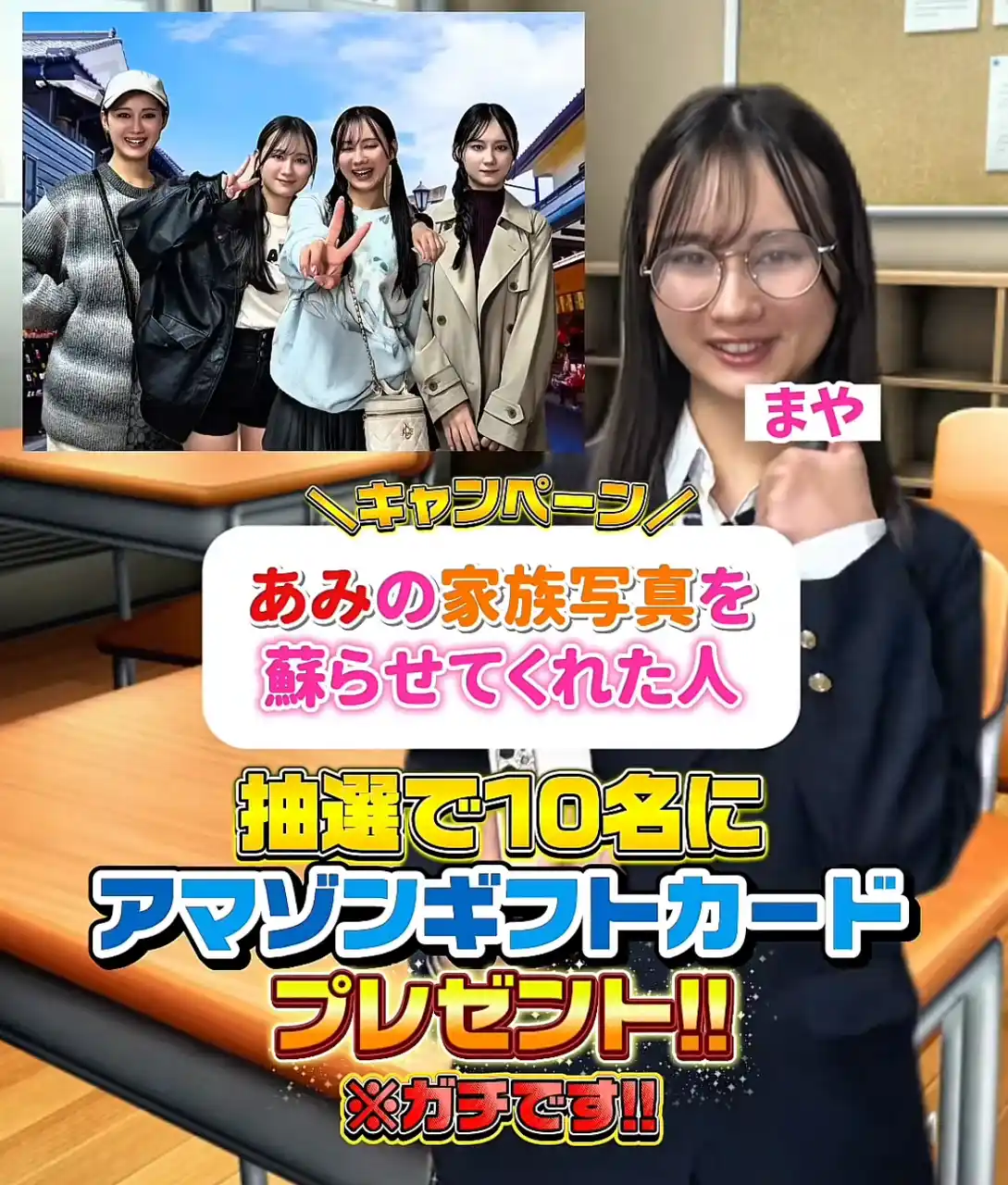 グループLINEで共有された入学式の集合写真。しかし、”あみ”だけ半目で写っている。阻止しようとするが、そこで"まや"が、Relumiの撮り直し機能で修正した写真を送ってくれるも… |