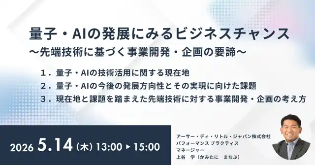 アーサー・ディ・リトル・ジャパン株式会社(本社:東京都港区、日本代表:祖父江 謙介、以下「ADL」)は、ADLパフォーマンスプラクティス、マネージャーの上谷学が「量子・AIの発展にみるビジネスチャンス」をテーマに2026年5月14日(木)、新社会システム総合研究所が主催するセミナーに登壇することを発表いたします。 |