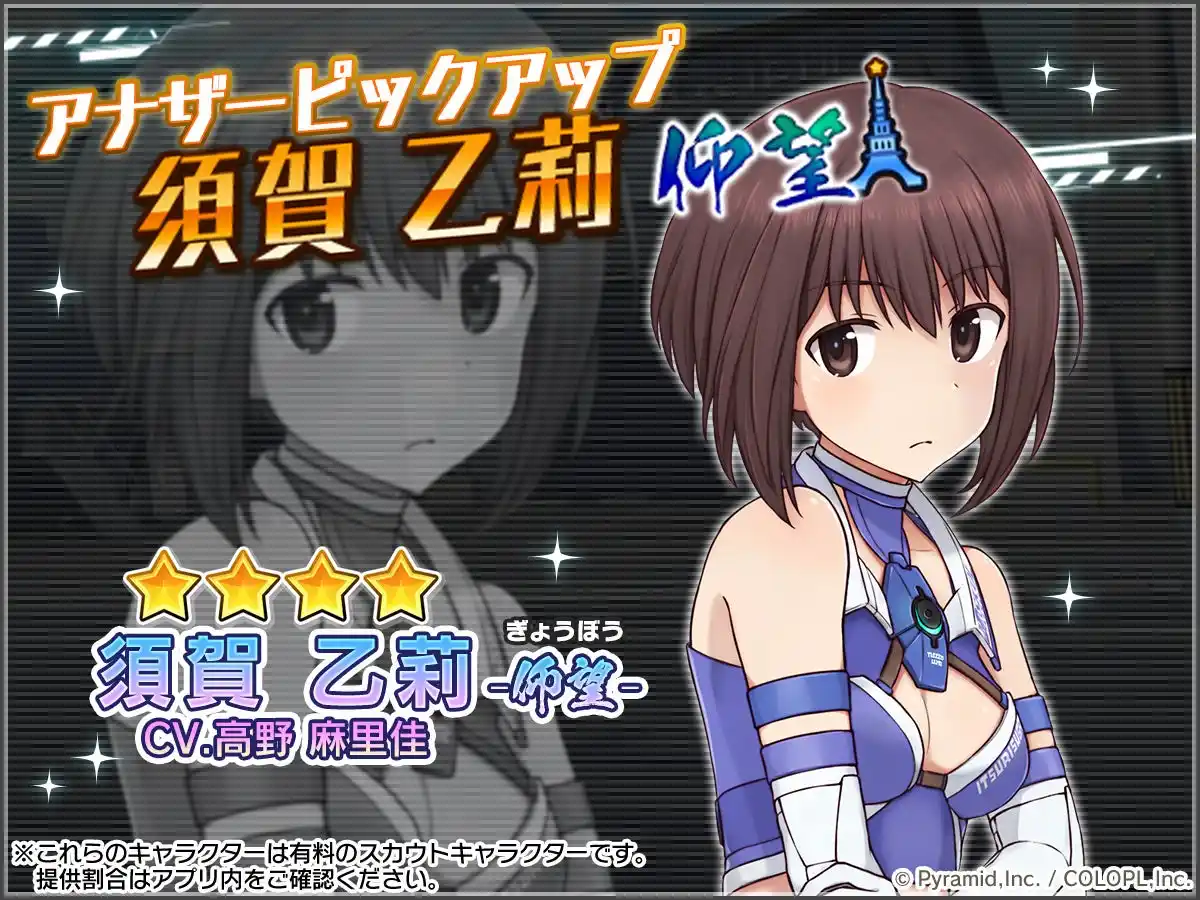 新ステラーキャラクターの登場にあわせて、乙莉が登場する復刻イベント「AEGiS P-1GP ホクホク伝説」や、アナザーキャラクター「須賀 乙莉【仰望】」の復刻スカウトも開催中です。 |