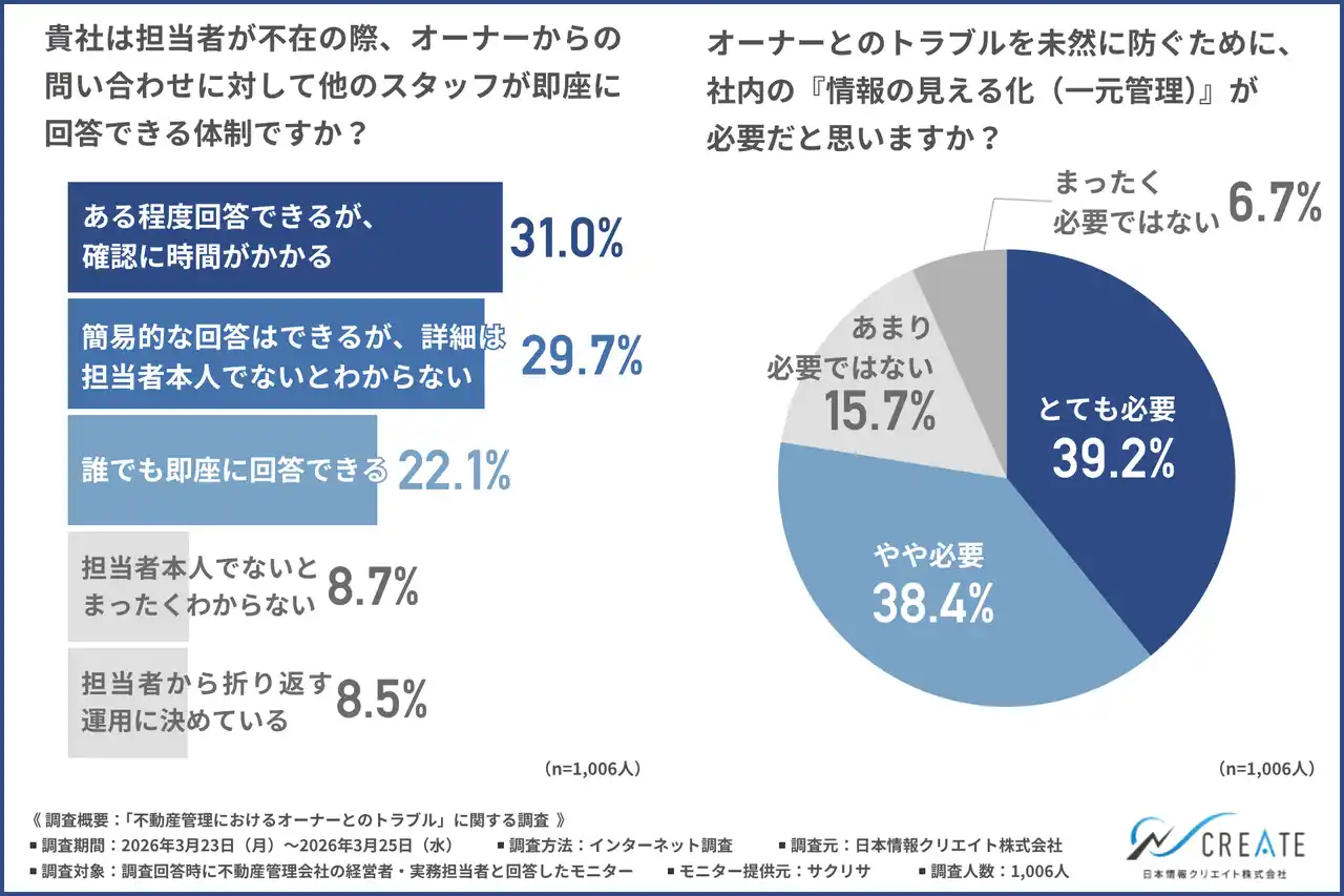 日本情報クリエイト株式会社(所在地:宮崎県都城市、代表取締役社長:辻村 都雄、証券コード:4054)は、不動産管理会社の経営者・実務担当者を対象に、「不動産管理におけるオーナーとのトラブル」に関する調査を行いました。