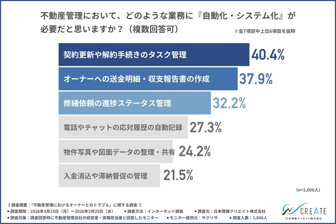 「不動産管理において、どのような業務に『自動化・システム化』が必要だと思うか」について尋ねたところ、『契約更新や解約手続きのタスク管理(40.4%)』と回答した方が最も多く、『オーナーへの送金明細・収支報告書の作成(37.9%)』『修繕依頼の進捗ステータス管理(32.2%)』となりました。 |