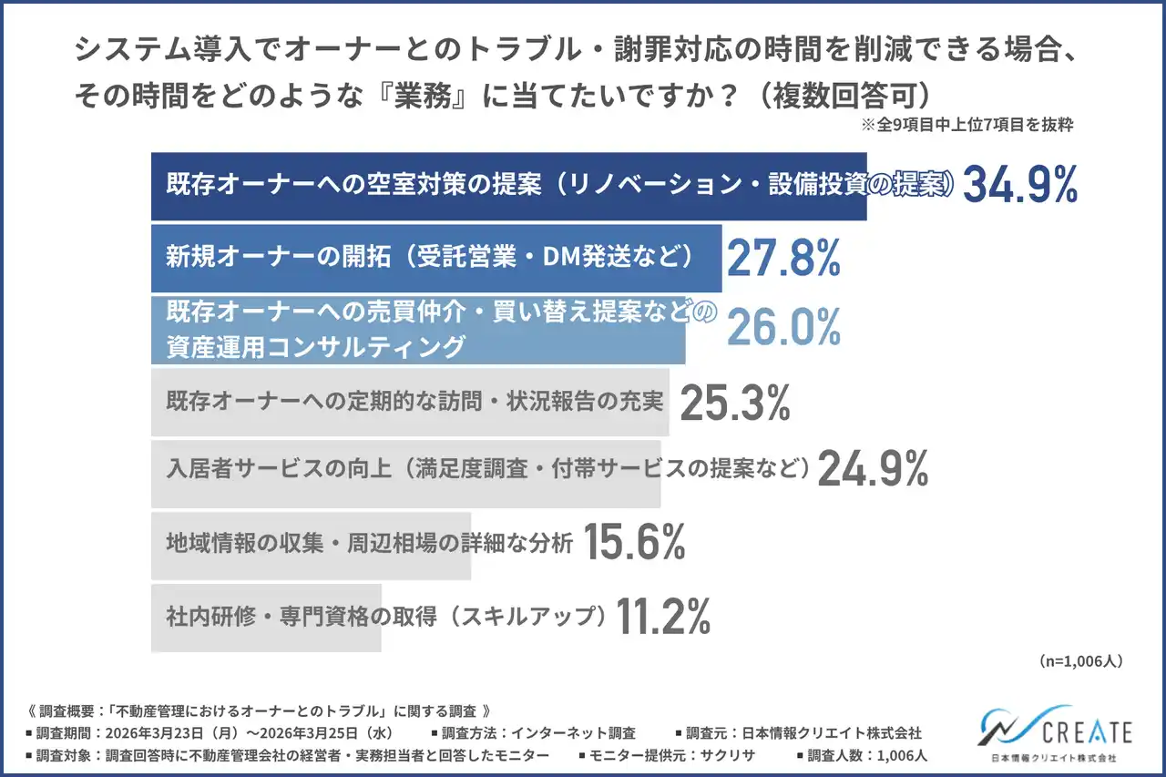「システム導入でオーナーとのトラブル・謝罪対応の時間を削減できる場合、その時間をどのような『業務』に当てたいか」と尋ねたところ、『既存オーナーへの空室対策の提案(リノベーション・設備投資の提案)(34.9%)』と回答した方が最も多く、『新規オーナーの開拓(受託営業・DM発送など)(27.8%)』『既存オーナーへの売買仲介・買い替え提案などの資産運用コンサルティング(26.0%)』となりました。 |