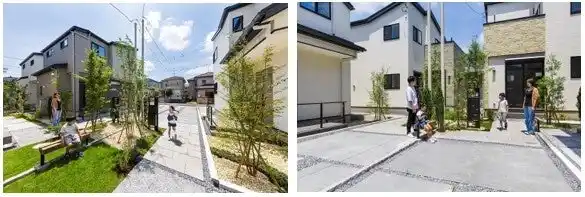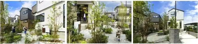 住民同士が自然とお互いを意識できる安心・安全な暮らし方を提案した30邸の分譲住宅です。道路に面した整形地と旗竿地が連続した区画となっており、通常の計画では余白にある「スキマ」は有効活用されず、アプローチとして完結してしまいます。そこで、敷地境界をシームレスにして、1戸では「スキマ」だった空間同士をつなげることで、広場となる「コア」へ昇華させました。「コア」は、樹木を中心とした空間を基本とし、ベンチ等を設置し、住民が立ち寄りたくなる工夫を施すことによって、自然なコミュニティの形成を促します。 |
