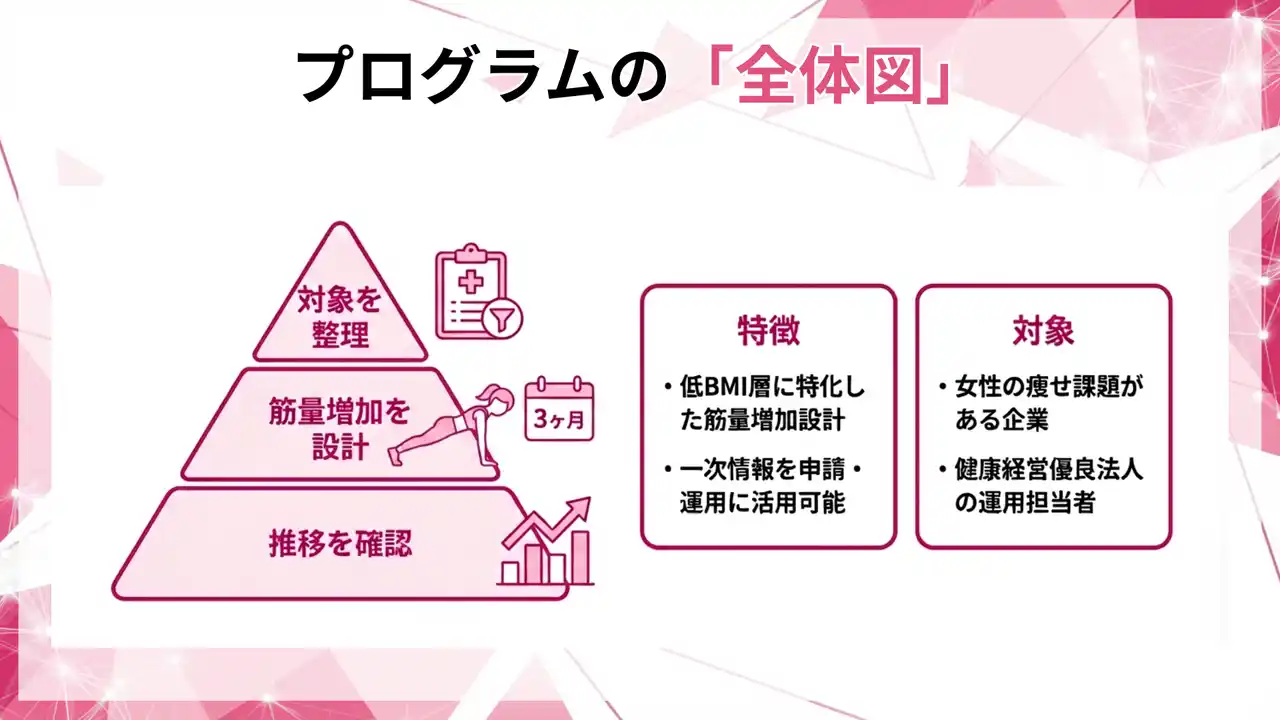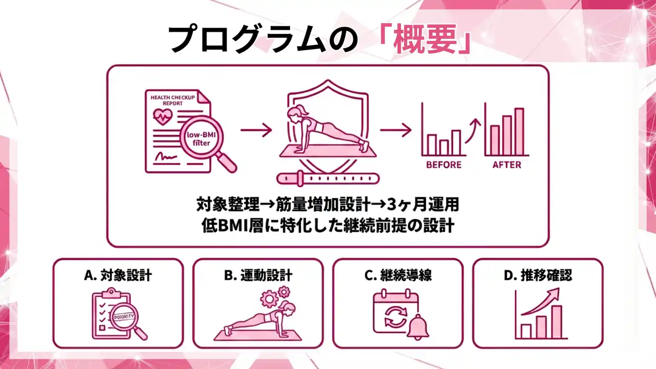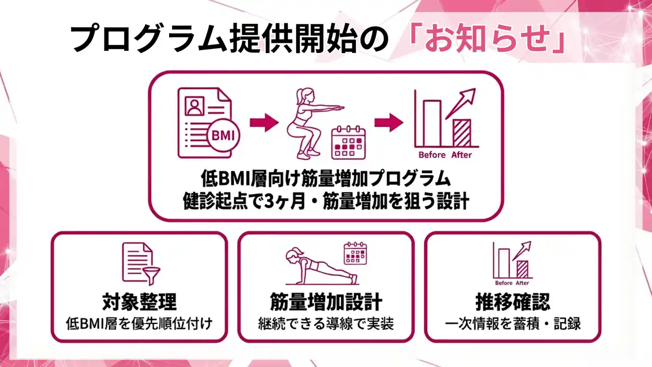 本プログラムは、企業が保有する健康診断結果等を起点に対象を整理し、低BMI層に対して筋量増加を狙う運動プログラムを3ヶ月で実装する支援です。 |