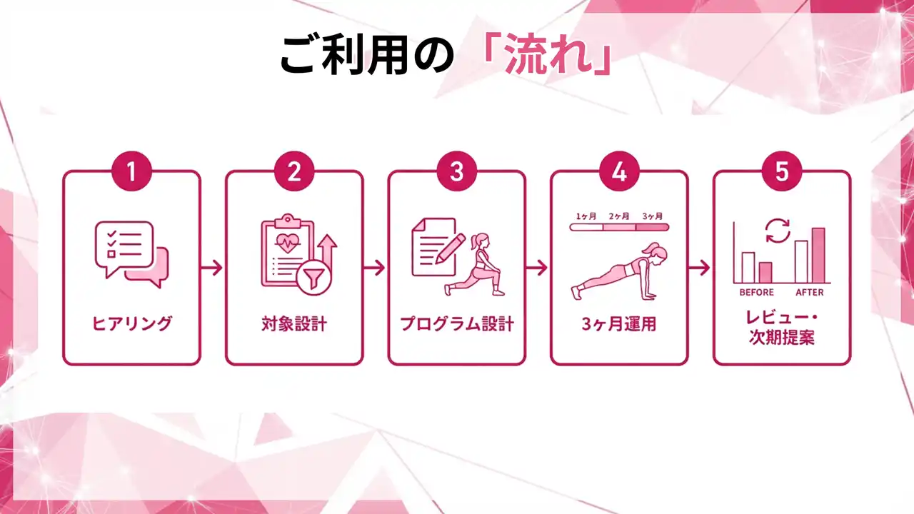 当社は、痩せ課題は筋量増加の設計が要であるという前提に立ち、運動習慣がない層でも実行しやすい導線を含めた運用パッケージとして提供します。 |
