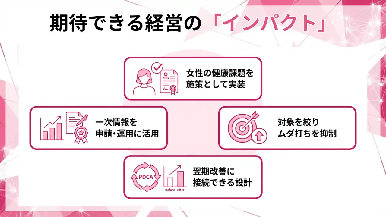 女性の健康課題への対応を、施策として実装できる 女性の健康課題への対応は健康経営の実務テーマとして整理されており、運用として回せる形に落とし込みます。 |