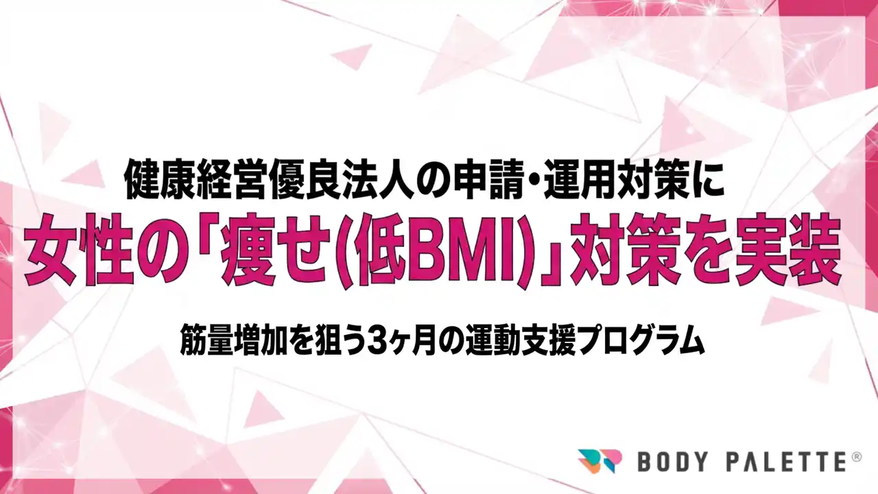 本プログラムは、健康経営優良法人の申請・運用を見据え、女性の健康課題の一つである低BMI・痩せ傾向に対して、筋量増加を狙う運動プログラムを3ヶ月で実装し、一次情報と推移確認までを整備する支援です。 |