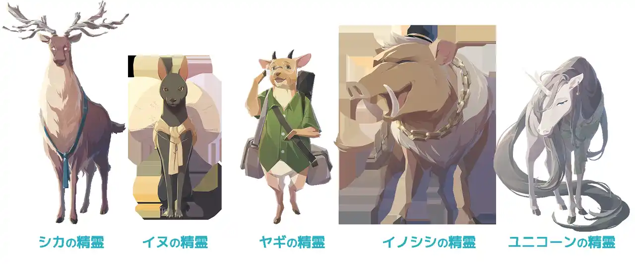 旅の途中で出会う動物の姿をした「神霊」。彼らと交流する中で、ボウの地についてや、帰り道への手がかりを得ていきます。 |
