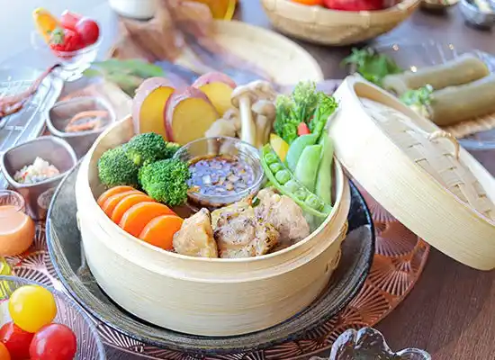 島の恵みを凝縮、島野菜と鶏のセイロ蒸し |
