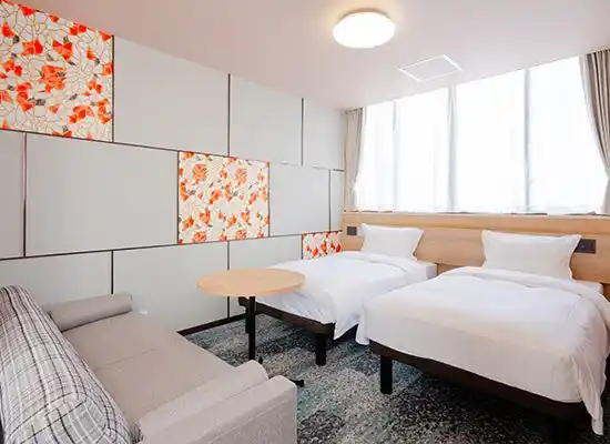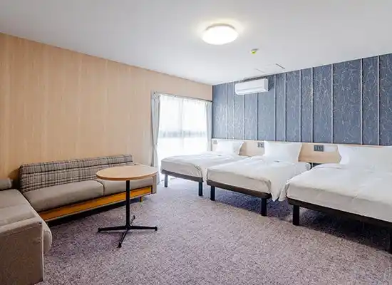 客室は「たびのホテル」ブランドの特長である、お客様視点での快適性を追求し、寝心地の良いベッドマットレスをはじめ、使い勝手に配慮したソファやテーブル、2ドア冷蔵庫、電子レンジ、さらには高画質のスマートテレビを完備しました。お部屋タイプもトリプルやフォースなどご家族やグループでもゆったりとお過ごしいただける多彩な客室をご用意いたしました。 |