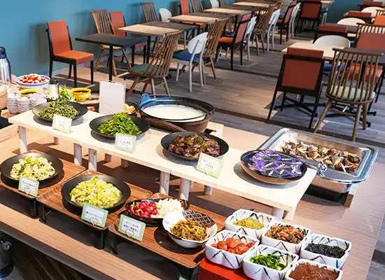 レストラン「島ごはん 若草」では、「佐渡島・新潟県の地域資源をふんだんに活用」「地産地消・県産県消」「遠くのごちそうより、近くの文化」をテーマに、佐渡の風土と暮らしに根ざした朝食をブッフェスタイルでご提供します。 |