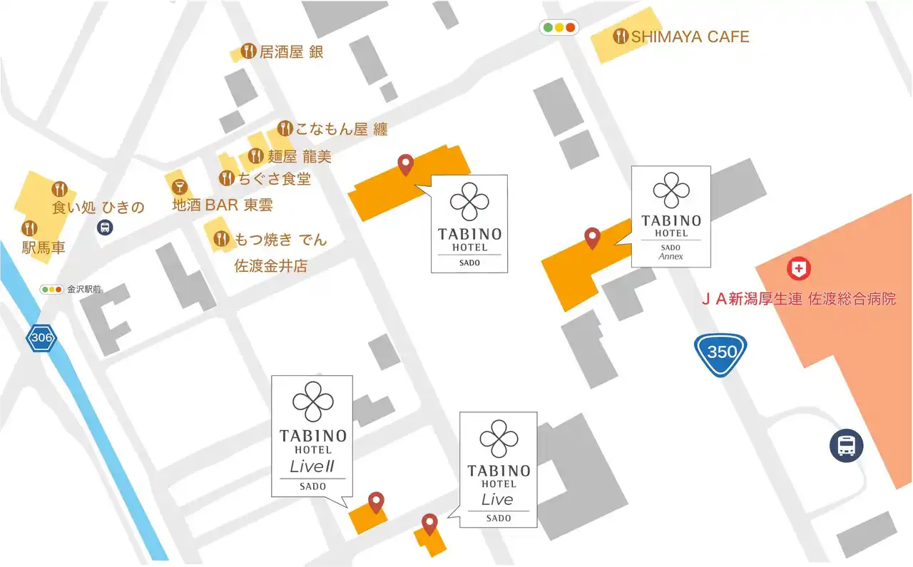 「たびのホテル佐渡Annex」は、佐渡島のほぼ中央に位置する「たびのホテル佐渡」の別館です。周辺にはスーパーマーケットやレストランなどの生活利便施設も点在し、観光・ビジネスのいずれの滞在においても使い勝手の良い環境が整っています。 |