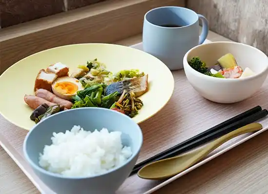 環境に配慮した「ライスレジン(R)」の器で味わう朝ごはん |