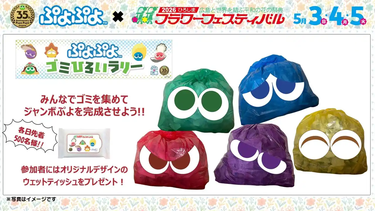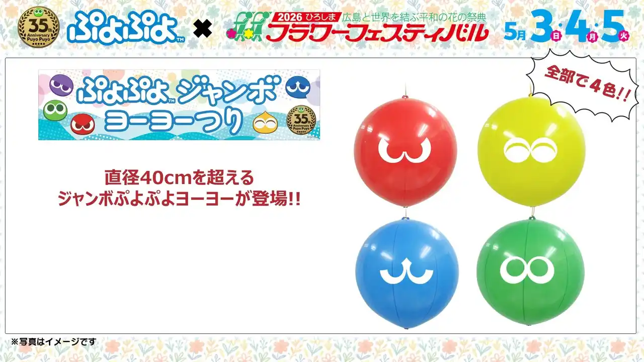 2026年5月3日(日)から5日(火)まで開催される広島を代表するお祭り「2026ひろしまフラワーフェスティバル」に、特別ブース「ぷよと広島パーク」の出展が決定しました。「ひろしまフラワーフェスティバル」とは、今年で49回目の開催となる、「広島と世界を結ぶ平和の花の祭典」です。コラボ企画として、「ぷよぷよゴミひろいラリー」や「ぷよぷよジャンボヨーヨーつり」の実施、35周年記念グッズの販売、フォトスポットの展開を予定しております。ぜひご来場ください。 |