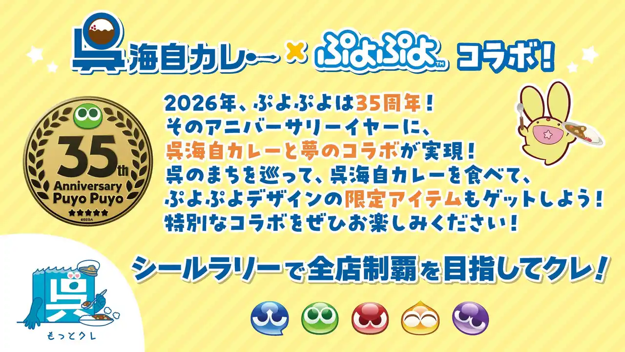 広島県呉市のご当地グルメ「呉海自カレー」とのコラボが実現しました。呉のまちを巡って「呉海自カレー」を食べ、シールを集めると、集めたシールの枚数に応じて「ぷよぷよ」デザインの限定グッズがもらえます。ぜひこの特別なコラボをお楽しみください。 |