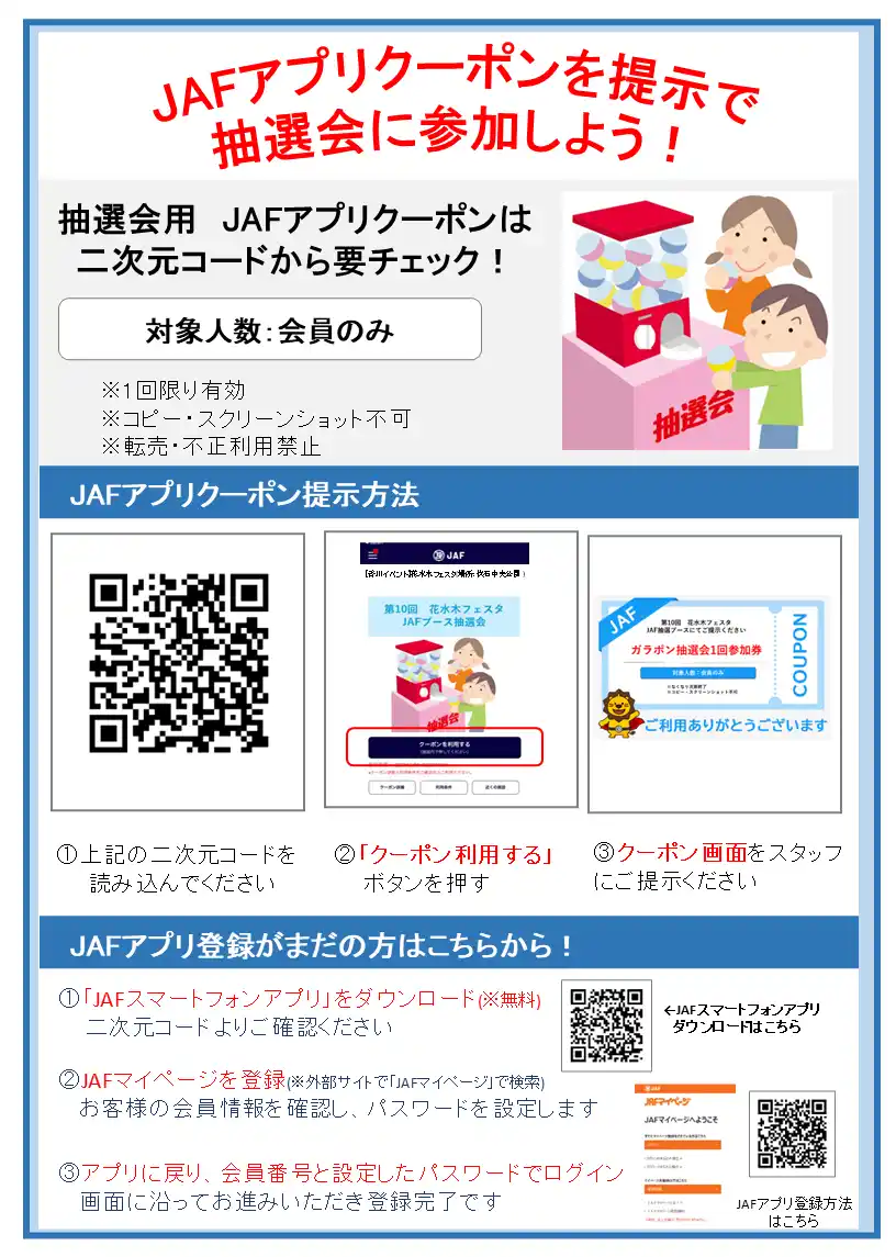 内容:JAFアプリクーポンを提示で抽選会に参加可能 |