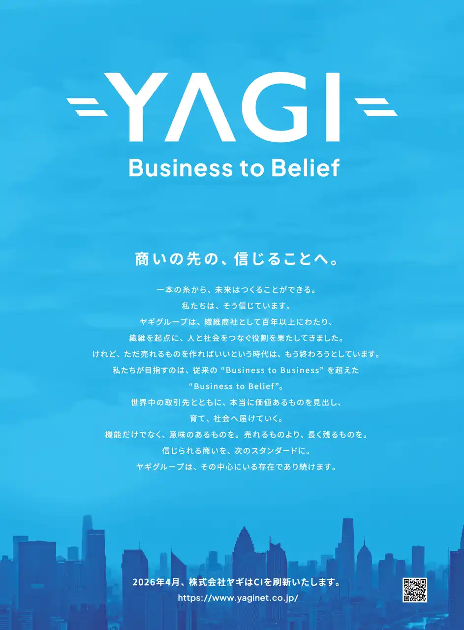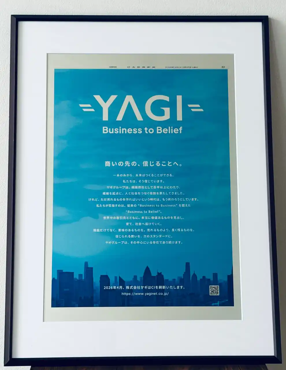 株式会社ヤギ(本社:大阪市中央区・東京都港区、代表取締役 社長執行役員:八木隆夫、以下「当社」) は、未来に向けた「新たな旗印」として新コーポレートロゴマークおよびタグラインを策定し、2026年4月1日からの展開開始に伴い、3月25日付の日本経済新聞(全国版・朝刊)に 企業広告を掲載いたしました 。 |