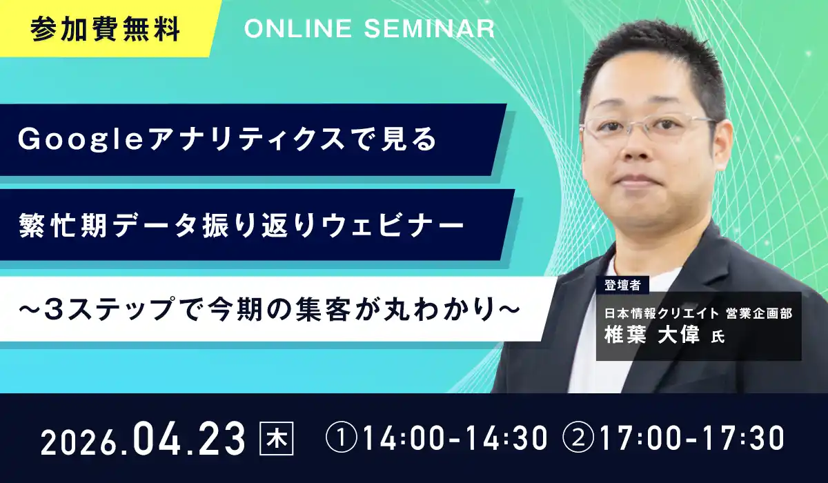 不動産テックを推進する日本情報クリエイト株式会社(本社:宮崎県都城市、代表取締役社長:辻村 都雄、証券コード:4054)は、2026年4月23日(木)に、不動産会社様向け無料オンラインセミナー『Googleアナリティクスで見る、繁忙期データ振り返りウェビナー~3ステップで今期の集客が丸わかり~』を開催いたします。 |