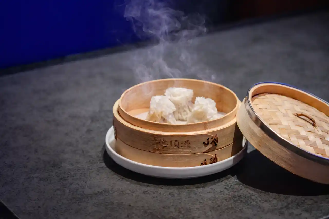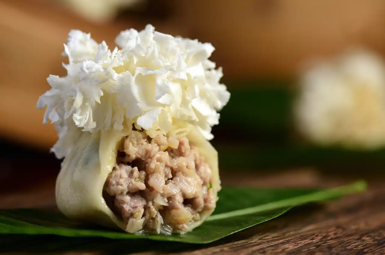 その名の通り、まるで一輪の花が咲いたような優美な見た目が最大の特徴です。 焼売の皮には、内モンゴル河套(かとう)平野産の高品質な小麦粉を使用。専用の道具「焼売槌」を用い、職人の高度な技で打ち出される皮は「蝉の羽のように薄く、蓮の花のような縁(薄如蝉翼、辺若荷花)」と称されます。この繊細なフリルが、目で見ても楽しめる芸術的な花の造形を生み出しています。 |