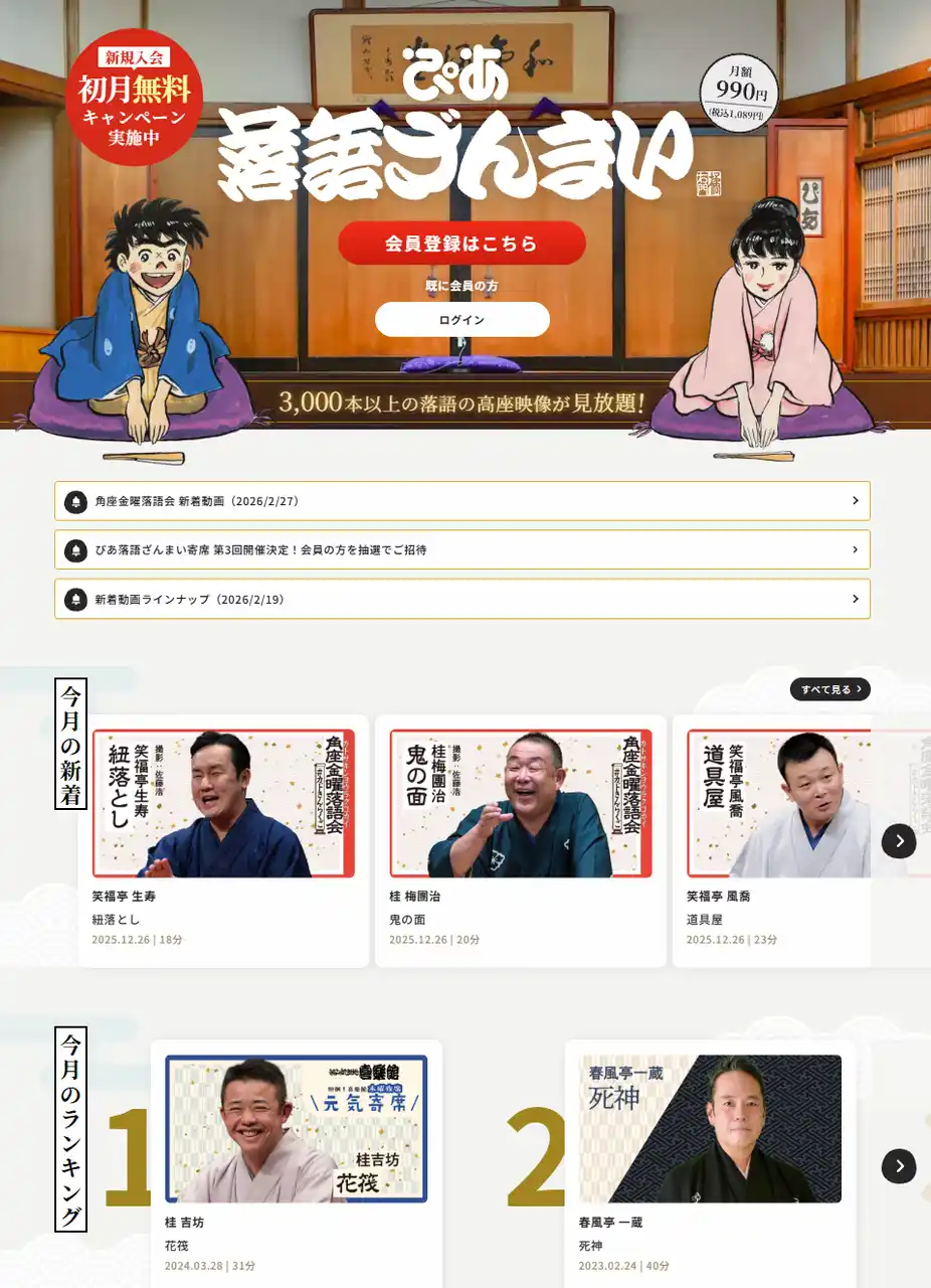 また、ただいま新規入会の初月無料キャンペーンを実施中。新規入会日(有料会員登録)から1ヶ月間は無料で高座映像の見放題サービスをお楽しみいただくことが出来ます。 |