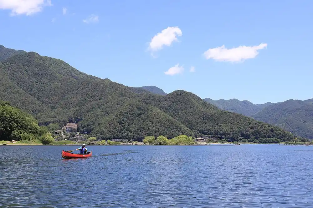 CAMP SATOMIYA付近の湖上からは北岸の山々や街並みを一望できます。特に夏は、山々の緑と河口湖の青のコントラストが美しく、河口湖の大自然を眺めながらカヌー・カヤックを楽しめます。 また、5分ほど漕いでキャンプ場西側の沖に出れば富士山が見えるので、ぜひ晴れた日は沖まで出て、湖上ならではの絶景をご堪能ください。 |