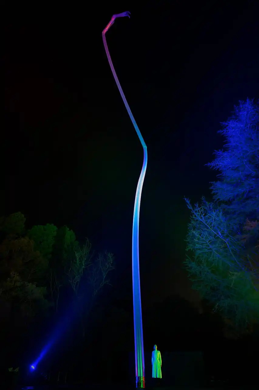 密集して立ち続ける光のovoid(卵形体)は、それぞれ自律している。ovoidは、人にかき分けられたり、風に吹かれたりして倒れると、立ち上がりながら光の色を変え、色特有の音色を響かせる。その周辺のovoidにも次々に呼応し、同じ色に変化し音色を響かせながら、連続していく。 |