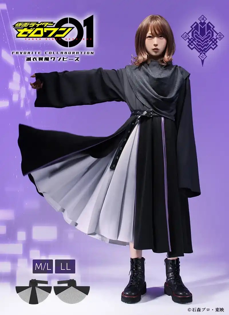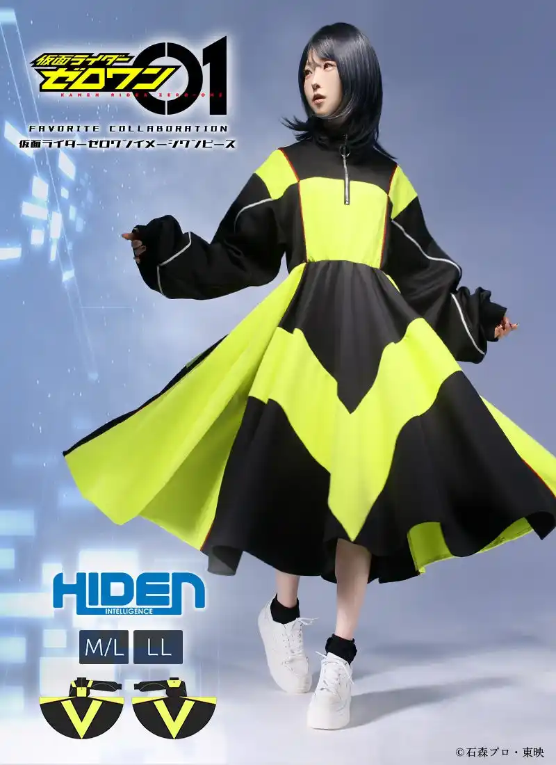仮面ライダーゼロワン ライジングホッパーをイメージしたジャージ素材のワンピース。カジュアルな印象もありながら、生地を贅沢に使用した全円スカートシルエット。背面には「01」のロゴをプリント。ウエストゴム仕様でゆったり着用可能。 |