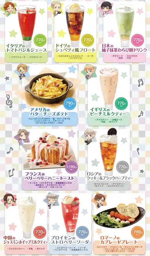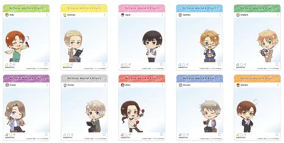 カラオケを楽しむ姿を描いたミニキャライラストを使用したコラボ限定グッズの販売をはじめ、コラボメニューの提供やコラボルームの展開など、『ヘタリア World★Stars』の世界観を存分にお楽しみいただけるコラボキャンペーンになっております。 |