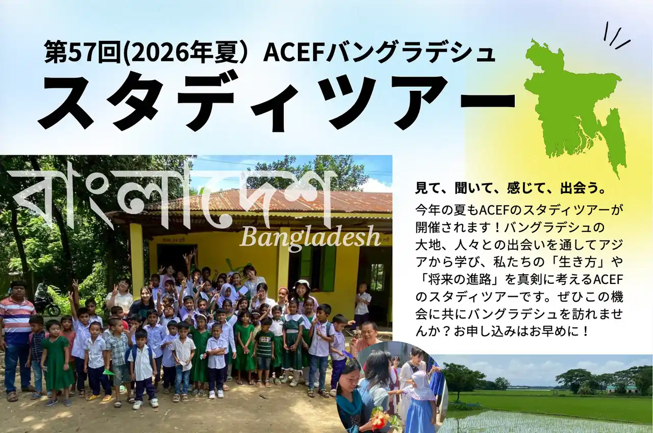 | バングラデシュの大地、人々との出会いを通してアジアから学び、私たちの「生き方」や「将来の進路」を真剣に考えるACEFのスタディツアーです。ぜひこの機会に共にバングラデシュを訪れませんか? |