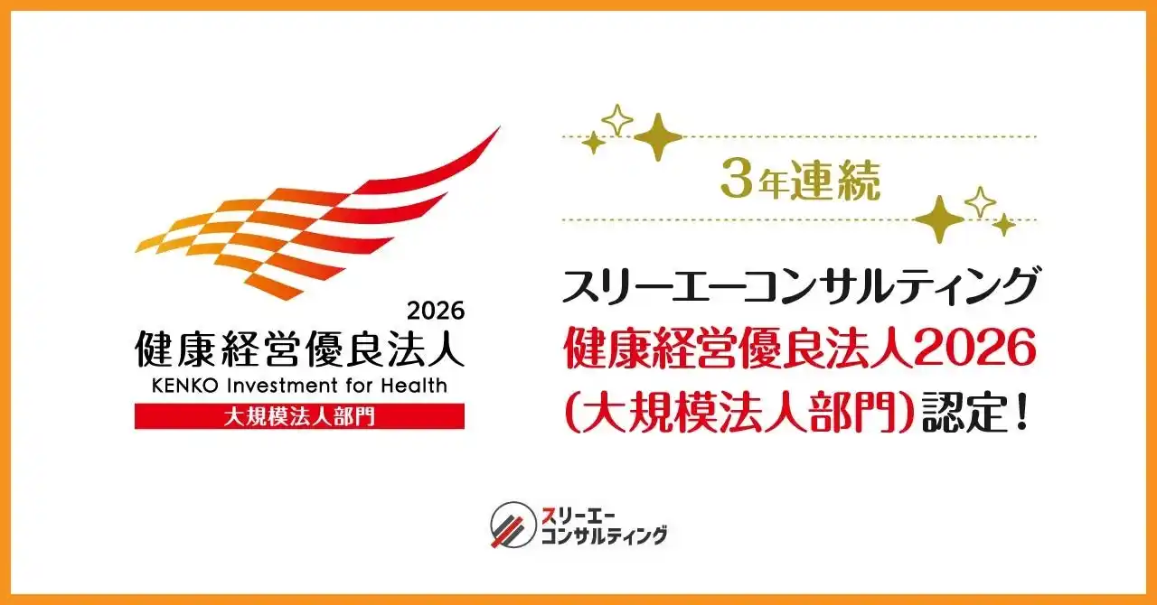 Pマーク、 ISOコンサルにおける支援実績 No.1(注1)のISO/Pマークの取得・運用支援サービス「認証パートナー」を提供する株式会社スリーエーコンサルティング(本社:大阪府大阪市、代表取締役社長:竹嶋 寛人)は、経済産業省が定める『健康経営優良法人2026(大規模法人部門)』に認定されました。当社では、健康診断の受診率100%、受診勧奨の取り組みや有給休暇の消化率100%などの取り組みを行っております。今後も従業員とご家族の健康保持 ・増進のために取り組みを続けてまいります。 |