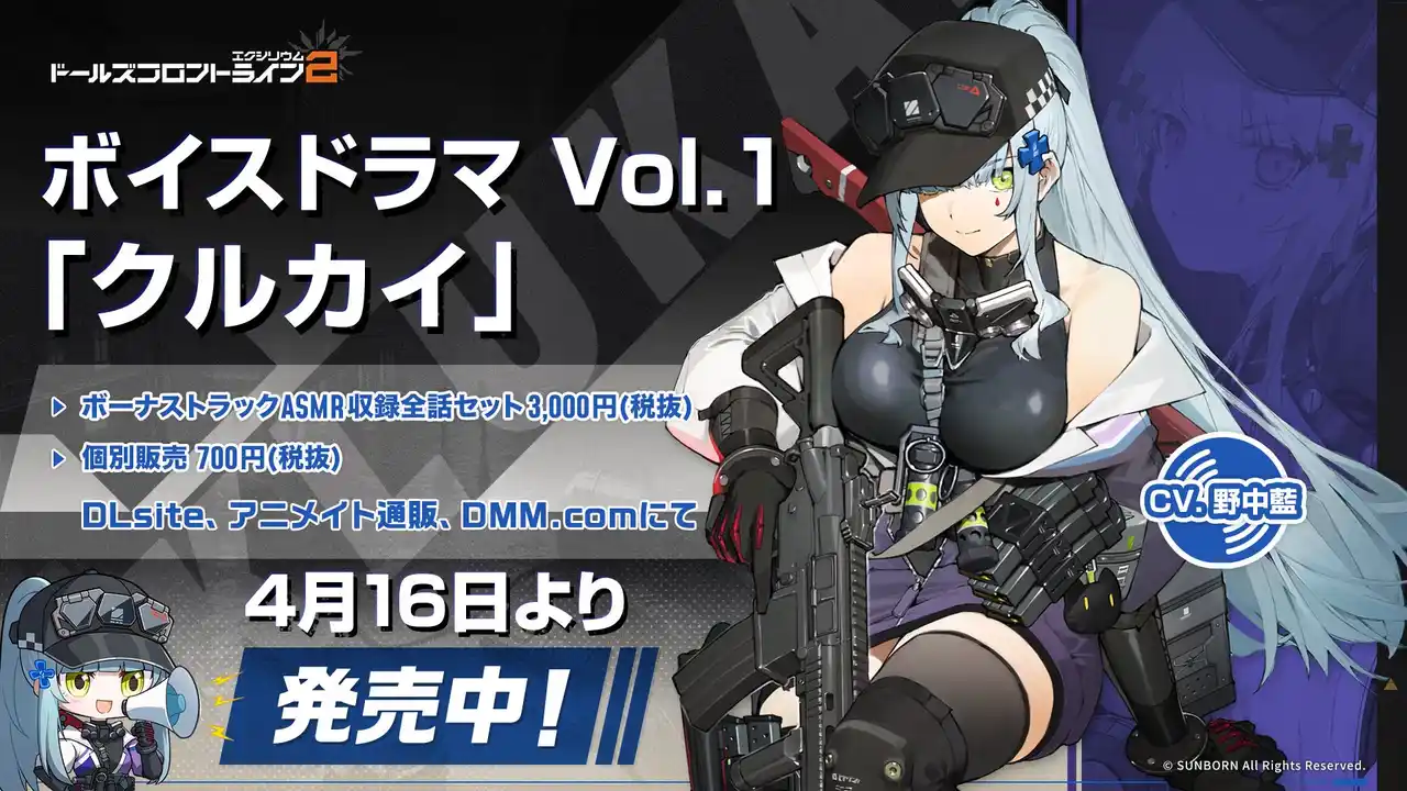 | スマホ/PC向け人形と切り開くポストアポカリプス戦略RPG『ドールズフロントライン2:エクシリウム(以下、「ドルフロ2」)』は、本日2026年4月16日(木)にボイスドラマシリーズ第1弾として、「クルカイ(CV.野中藍)」を発売したことをお知らせいたします。 | |||