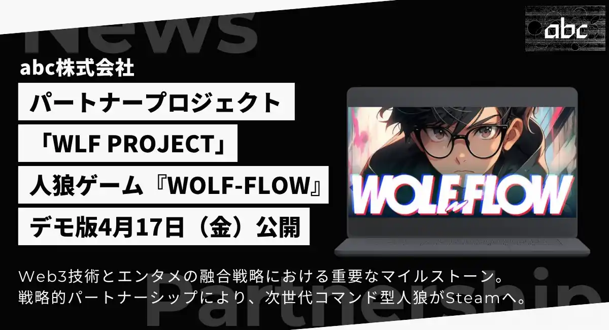 abc株式会社(本社:東京都港区、代表取締役:松田 元、証券コード:8783、以下「当社」)は、当社の戦略的パートナープロジェクトである「WLF PROJECT」が開発を進めるPC向けオンライン対戦ゲーム『WOLF-FLOW』のデモ版が、2026年4月17日(金)よりSteamにて公開されることをお知らせいたします。 |