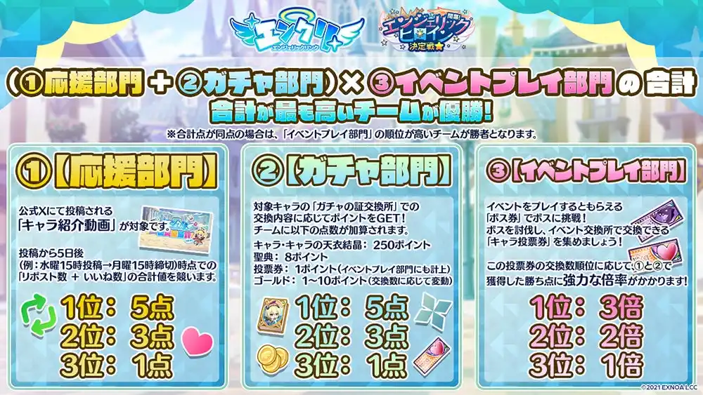 | Xでの応援、ガチャ、開催中のイベントでのチームの獲得点数に応じて優勝チームが決定! | |||