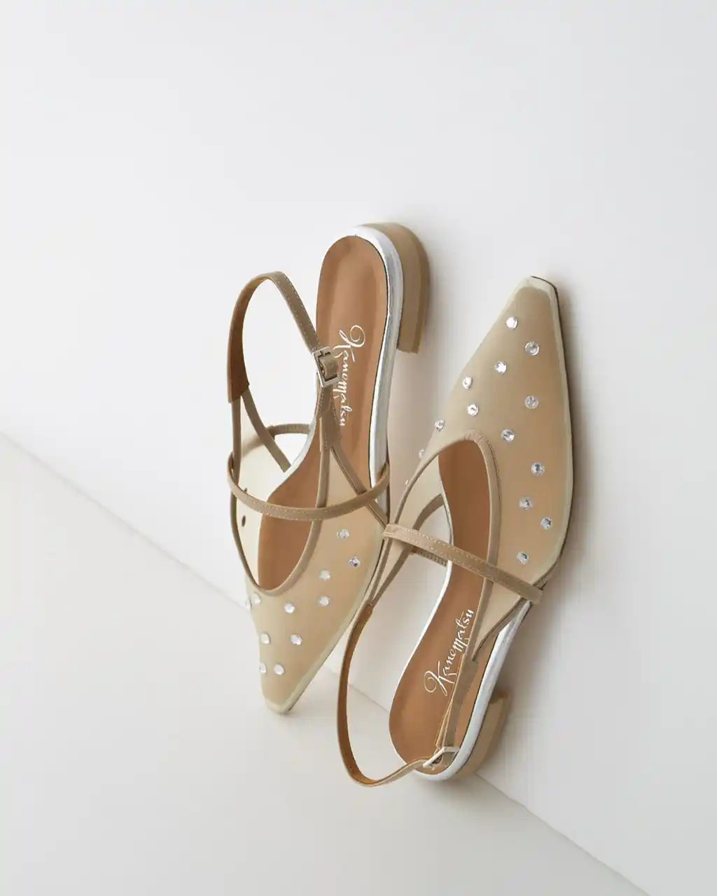 シアー素材に水玉のように散らしたラインストーンが大人可愛いバックベルトパンプス。少しい深めのUカットとメリージェーンをバックベルトにしたようなフォルムでトレンド感あふれるデザイン。ふんわりとした足当たりで、見た目以上にやさしい履き心地です。 |