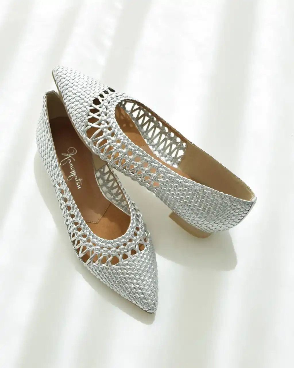 サイドまで入ったラフな編み込みで抜け感たっぷりのフラットパンプス。つま先部分は閉じた編み込みにすることできちんと感があり、オフィスシーンでも活躍。モノトーンはもちろん、春らしいカラー物との相性も良いシルバーがおすすめカラーです。 |