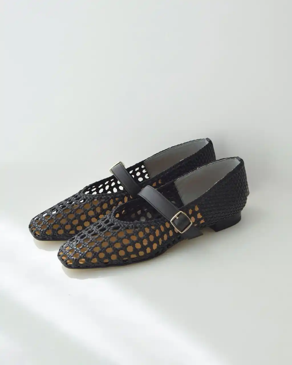 ザックリとした籠目の編み込みがネット状に見えるメリージェーン風パンプス。太めのベルトだからガーリーになりすぎず、コーディネートのポイントになるデザイン。さりげない肌見せが涼し気かつ、靴下合わせもおすすめのアレンジです。 |