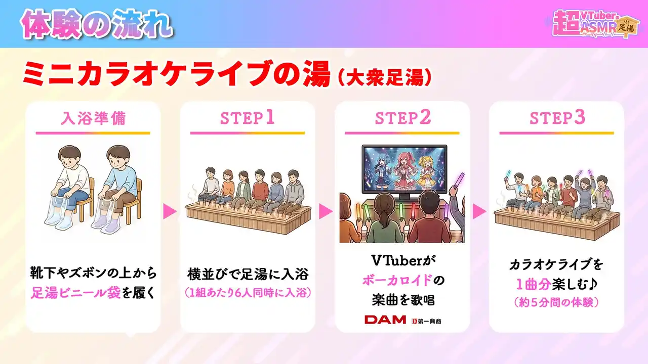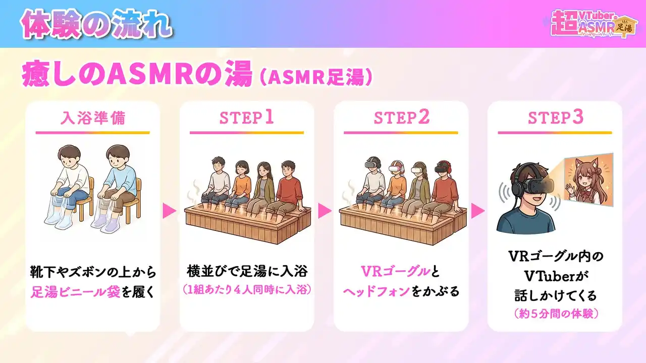 足湯に浸かりながら、VTuberによるリアルタイムのASMRを楽しめる足湯です。 |