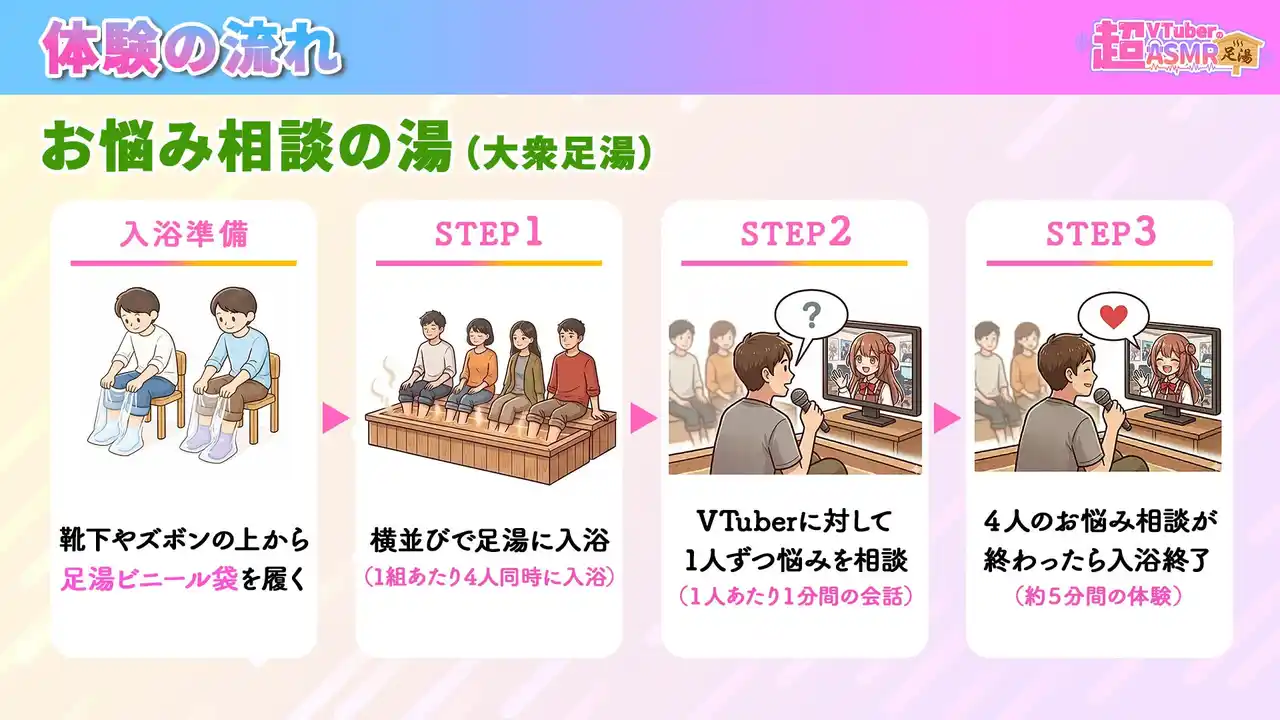 足湯でリラックスしながら、VTuberにお悩み相談ができる足湯です。 |