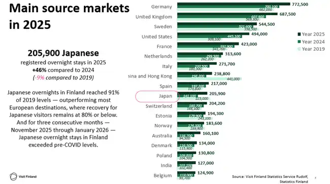 2025年、フィンランドにおける日本人の宿泊数は205,900泊を記録し、前年比で46%増加しました。この数値はコロナ禍前の2019年水準の91%に達しており、他の多くのヨーロッパ主要国における日本人旅行者の回復率が80%以下にとどまる中、フィンランドはそれを大きく上回る力強い回復を示しています。 |