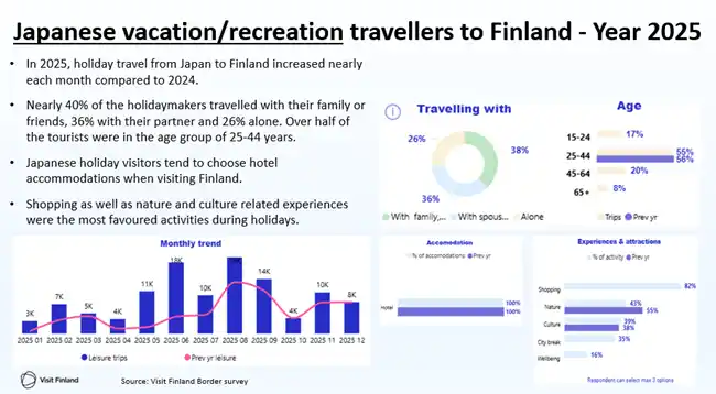 さらに、2025年11月から2026年2月までの3ヶ月連続で、日本人宿泊数は2019年同月比を上回りました。これにより、フィンランドにおけるインバウンドは、コロナ禍からの回復フェーズを超え、成長フェーズへと移行しつつあることが明らかになっています。 |