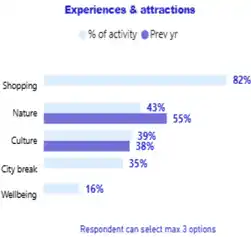 さらに、2025年の日本人旅行者による総消費額は前年比61%増と大きく伸長しており、旅行需要の質的な向上も示されています。こうした背景には、コロナ禍を経て変化した海外旅行のニーズがあります。従来の観光中心の旅行から、心身のリフレッシュや現地のライフスタイルを体験するなど、より体験価値を重視する傾向が高まっています。実際に、日本人旅行者の動向を見ると、ショッピング(82%)が最も高い一方で、自然(43%)や文化(39%)といった体験型のアクティビティへの関心も高いことが分かっています。